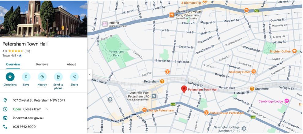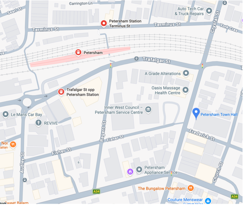 Change trains at Strathfield/Burwood or Central/Redfern for connections from other lines. - On exiting Petersham Station, walk south along Crystal Street — the Town Hall is approx 250m from the station. (See maps below).